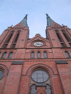 | Skien kirke fra 1894. Kirken er byens kjennetegn med sine to tårn på høyden midt i byen. Det er en flott kirke som nå repareres utvendig. Her må mange ulike stein skiftes. | ||||||||||||