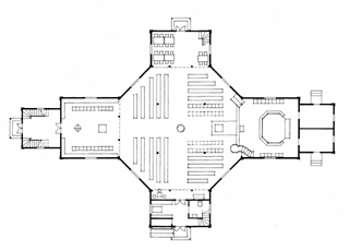 kirkerom med rik artikulering. Under galleriene er det kirketorg / vinterkirke,