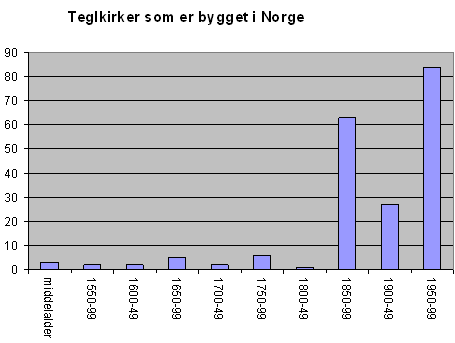 Først etter 1850 blir bruk av tegl et vanlig materiale. Mange ting skjer da samtidig. Norge industrialiseres og byene vokser. Vi får etter hvert en arkitektstand med røtter fra Danmark og Tyskland, og i 1851 får vi en kirkelov som krever plass i kirkerommet til 30% av befolkningen. Forbildet for den kraftige kirkebyggingen som nå finner sted, kommer fra Tyskland, hvor nygotikken utført i teglstein har fått fotfeste. Samme stil overføres også til trekirkene. Dette blir kirkestilen som setter preg på vårt land, - en langstrakt kirke med tårn ved inngangen i vest og tilbaketrukket kor i øst. Ser vi på årene 1850- 1880 blir 40 kirker bygget i tegl, og nå er det ikke bare i byene at man bygger brannfast. De rike bygdene er også med og er i flertall. |