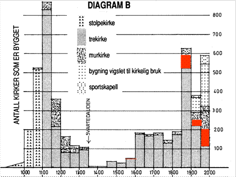 På sidene 324- 327 er kirkebygging gjennom 1000 år vist. Her er det skilt mellom bygg som er laget i tre eller mur. Utgangspunktet for delingen er veggenes utførelse. Med unntak for kirkebygging de siste 50 år, har trekirken dominert. Vel 2/3 av kirker som står i dag er bygget av tre. 14,8 % er bygget i stein, 11,8% i tegl og 6,7% i betong/lettbetong. I middelalderen ble tegl i stor grad brukt i kirkebyggingen nedover i Europa. Hos oss var dette en sjeldenhet, bare 3 bygg er registrert. Ved bygging av byer og befestninger etter reformasjonen ble det bygget noen få teglkirker, noen i utmuret bindingsverk. Fra reformasjonen til 1850 har vi 8 teglkirker som står nå. Mange av forgjengerne var utsatt for brann. Østre Fredrikstad er f.eks. den femte teglkirken på stedet. |