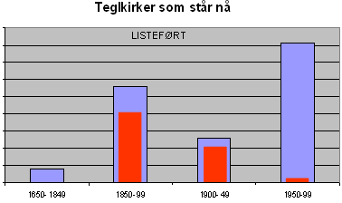 Diagrammet vises at Riksantikvaren har sterke interesser i teglkirkene som er bygget før 1950. Det røde feltet viser at 75% av kirkene i perioden 1850-99 og 80% i perioden 1900-49 er listeført som verneverdige. |