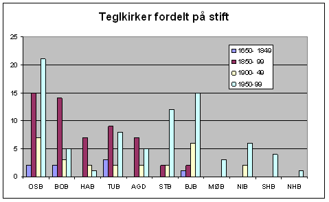 Når vi fordeler teglkirkene etter alder og bispedømmer, kommer det klart frem at teglkirker frem til 1950 først og fremst er et østlandsfenomen. Med de nye konstruksjonene kommer også Vestlandet sterkt med, men også videre nordover. |
