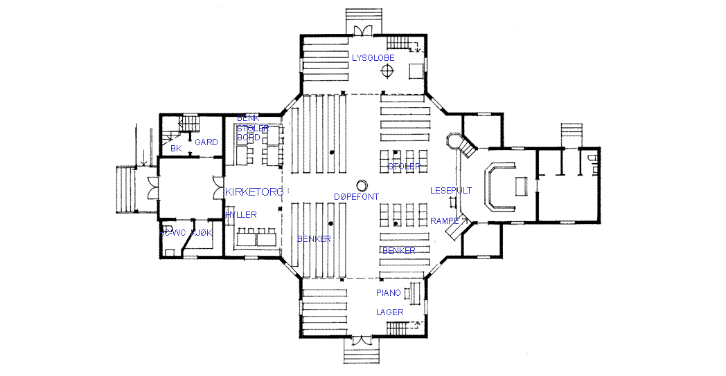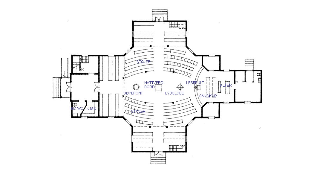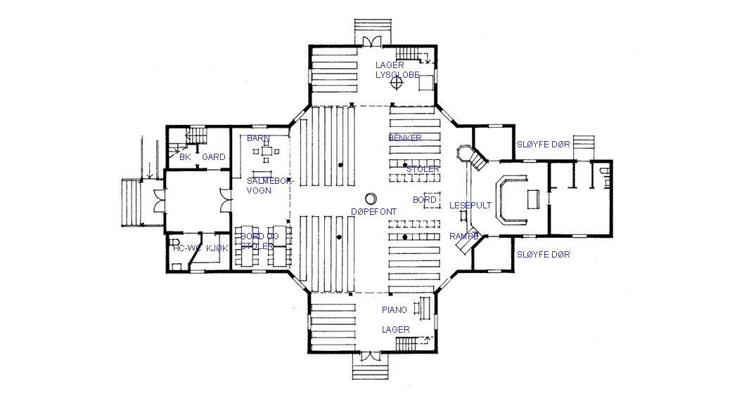 | FORANDRING 1 Rom ved siden av våpenhuset får kjøkken og hc-wc. Kirkerommet har tre gallerier. Under blir det "rom i rommet" som utnyttes til ulike behov. Ved hovedinngangen er det barnekrok, undervisning og kirkekaffe. Under galleriet i nord er det et andaktssted med lysglobe og sidealter. Sidealteret brukes også som nattverdbord. Det plasseres da i midtaksen. Under galleriet i sør er det plass for større musikkinstrumenter. En rekke benker er fjernet, og noen sitteplasser erstattet med stoler. Andre benker er snudd 90 grader mot en handlingsakse i midtaksen. Det er rampe opp til koret. | |||||||