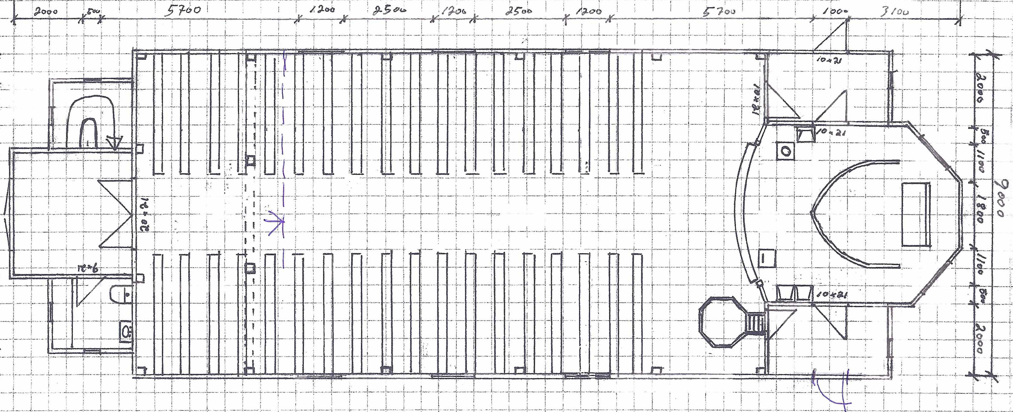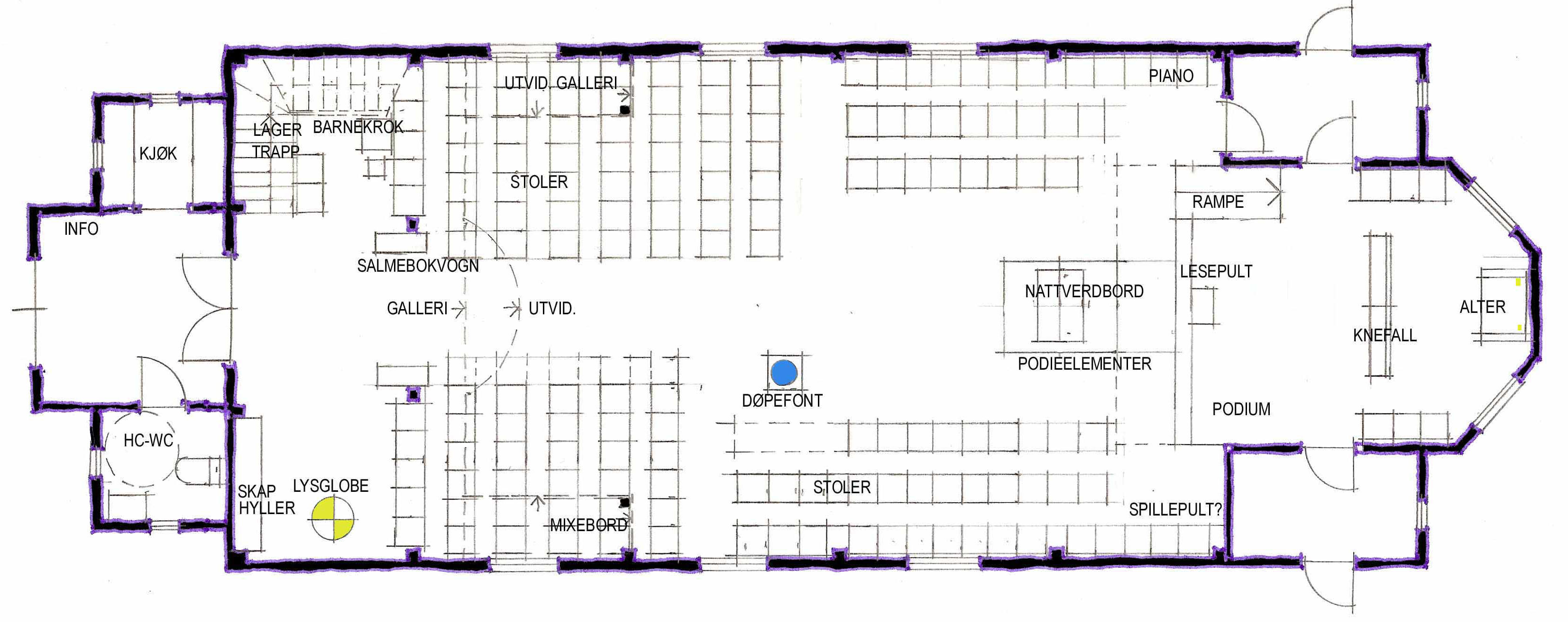 | Forslag til forandringer er vist nedenfor. Ved våpenhuset er trapperom til galleri erstattet med et lite kjøkken. Ny trapp til galleriet er plassert i selve kirkerommet. Under galleriet er det plass til andaktssted (lysglobe), barnekrok og oppbevaringsmøbler (salmebokvogner). Galleriet er utvidet litt, slik at man kan passere spillepulten. Det er også antydet forlengelse av galleriet langs sideveggene. Det gir flere positive bruksforhold. På minussiden kommer mindre lys inn i kirkerommet. Benkene er erstattet med stoler. Den gamle døpefonten er plassert nesten midt i skipet. Da får den en markert og symbolsk plass og står ikke i veien fremme i koret. Skrankene i koråpningen er tatt bort, og podiet har fått rett avslutning, slik at det er enkelt å sette podieelementer inntil podiet. En fast rampe fører opp til koret. Tegningen viser et nattverdbord som er plassert på flyttbare podieelementer. Dette området forandrer karakter / møblering etter hva som skal skje. Prekestolen er tatt bort, og døren i veggen tettet igjen. Alteret er flyttet inntil veggen. Se alter og nattverdbord. Alterringen er erstattet med knefallselementer, som settes frem etter behov. Miksebord er plassert under nytt sidegalleri. Evt. kan det være på dette galleriet. Spillepult for elektronisk orgel er fremme ved siden av koråpningen. | ||||||||||