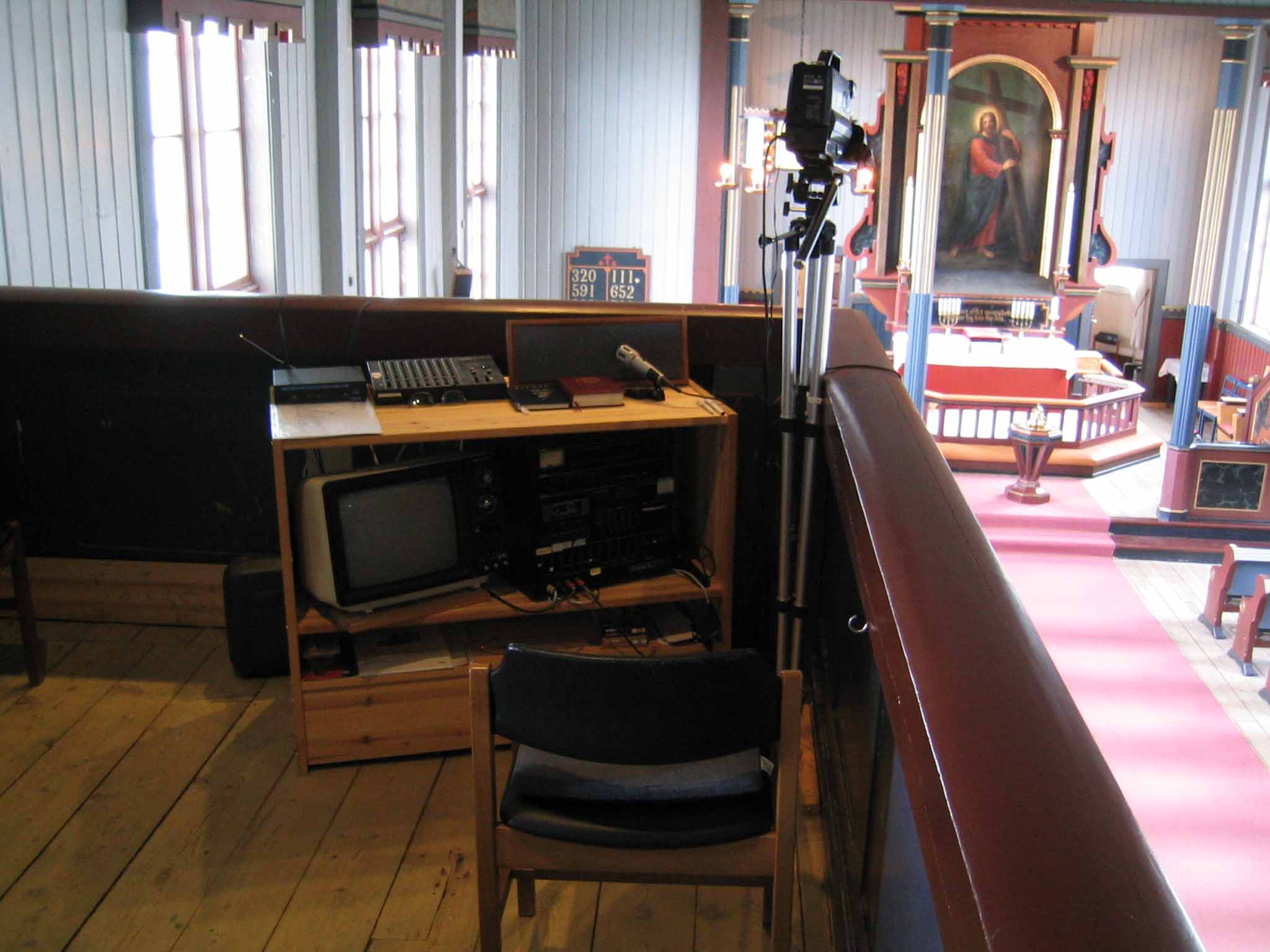 For tv-overføring av gudstjenesten til andre bygg, har man her i Rindal kirke rigget seg til på galleriet. | |||||