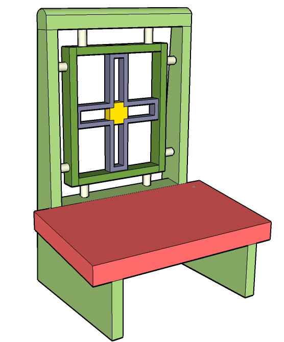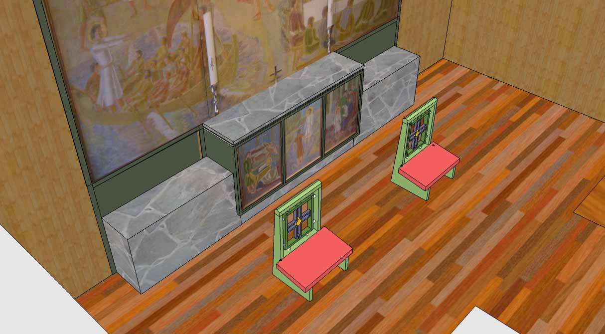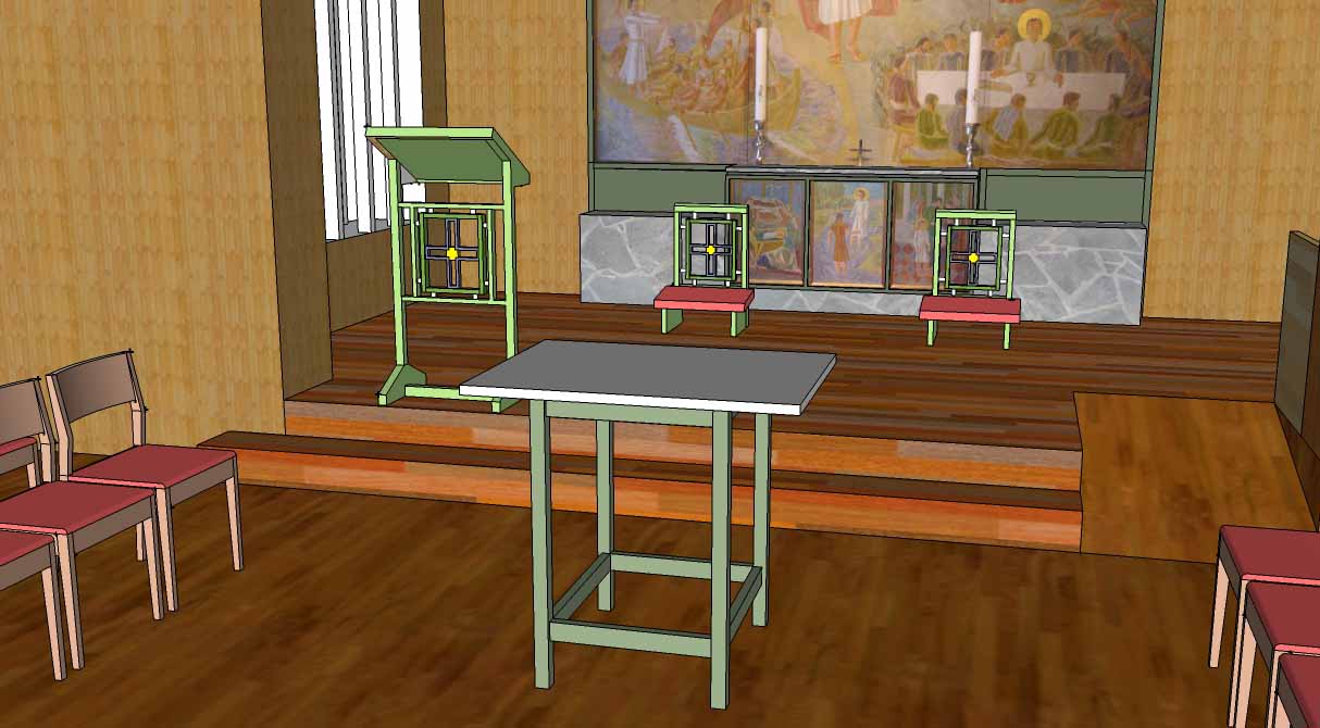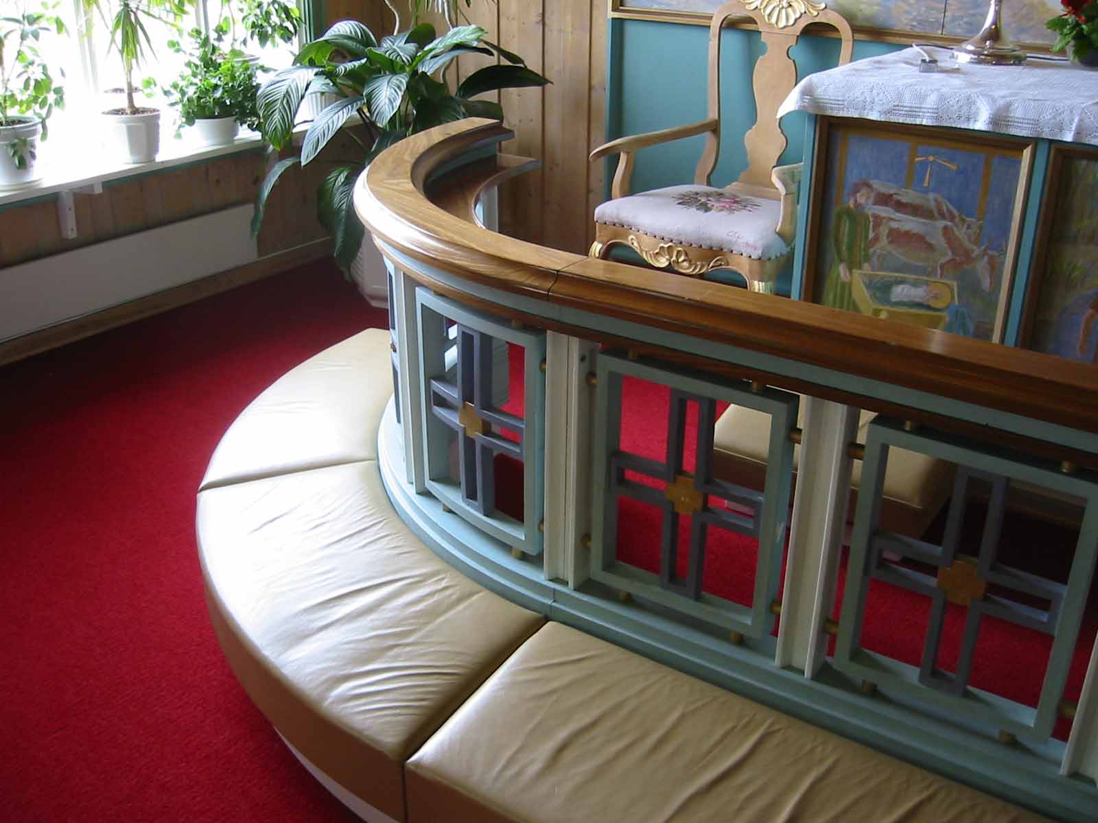 Elementer fra den gamle alterringen brukes i knefall og lesepult. For mer informasjon om nattverdbord, bordalter og alter. Se også Solvangkirken. |
